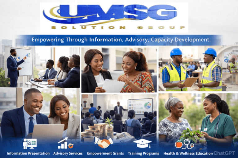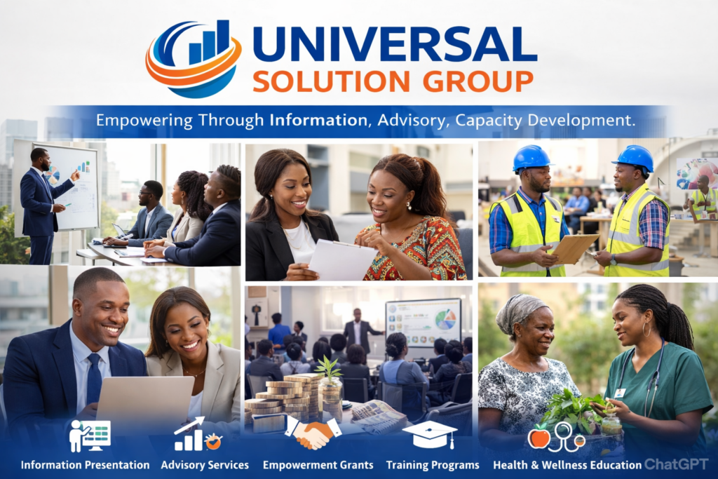 Universal Solution Group is a professional Information Presentation and Advisory Services Company dedicated to empowering individuals, businesses, and communities through structured information, strategic guidance, and capacity development.
